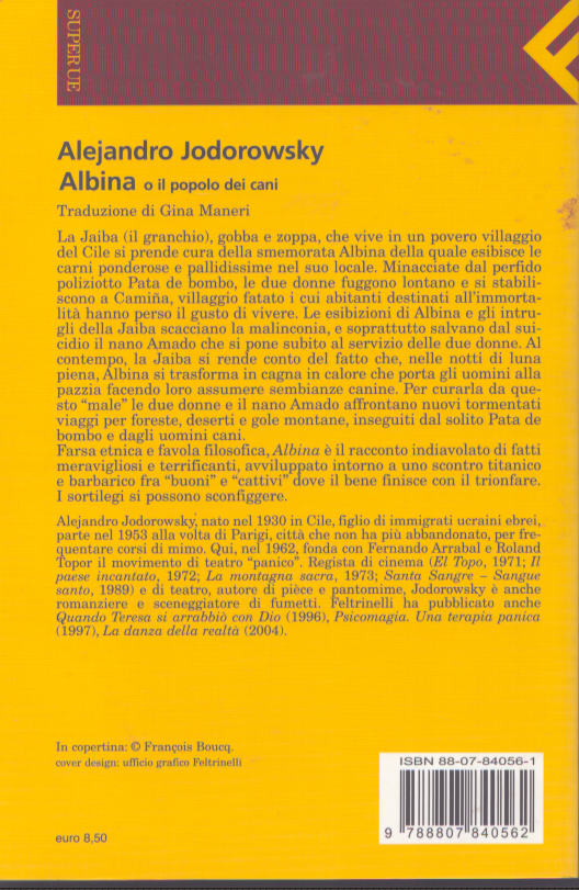 Racconto iniziatico e favola filosofica. Albina è la storia indiavolata di fatti meravigliosi e terrificanti, avviluppata intorno a uno scontro titanico e barbarico fra “buoni” e “cattivi”. La Jaiba (il granchio), gobba e zoppa, si prende cura della smemorata Albina della quale esibisce le carni ponderose e pallidissime nel suo locale. Minacciate da un perfido poliziotto, le due donne fuggono lontano e si stabiliscono a Camina, villaggio fatato i cui abitanti, destinati all’immortalità, hanno perso il gusto di vivere. Al contempo la Jaiba si rende conto che, nelle notti di luna piena, Albina si trasforma in cagna in calore che porta gli uomini alla pazzia facendo loro assumere sembianze canine. Per curare questo “male”, le ..