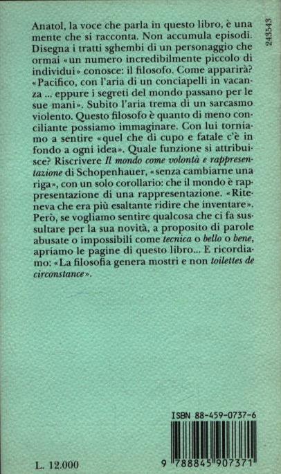 Anatol, la voce che parla in questo libro, è una mente che si racconta. Non accumula episodi. Disegna i tratti sghembi di un personaggio che ormai «un numero incredibilmente piccolo di individui» conosce: il filosofo. Come apparirà? «Pacifico, con l’aria di un conciapelli in vacanza … eppure i segreti del mondo passano per le sue mani». Subito l’aria trema di un sarcasmo violento. Questo filosofo è quanto di meno conciliante possiamo immaginare. Con lui torniamo a sentire «quel che di cupo e fatale c’è in fondo a ogni idea». Quale funzione si attribuisce? Riscrivere Il mondo come volontà e rappresentazione di Schopenhauer, «senza cambiarne una riga», con un solo corollario: che il mondo è rappresentazione di una rappresentazione. «Riteneva che era più esaltante ridire che inventare». Però, se vogliamo sentire qualcosa che ci fa sussultare per la sua novità, a proposito di parole abusate o impossibili come tecnica o bello o bene, apriamo le pagine di questo libro… E ricordiamo: «La filosofia genera mostri e non toilettes de circonstance».