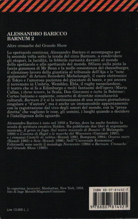 Barnum è sinonimo di spettacolo circense. Per Baricco, è la parola-filtro con cui si diverte a guardare il mondo nei suoi interventi giornalistici (prima su “La Stampa” di Torino, indi su “la Repubblica” con cui continua a collaborare): che siano eventi minori e marginali o grandi occasioni (la rivisitazione dell’arte di Maria Callas, il terremoto in Umbria, un viaggio in Giappone, l’arte di Pollini, l’eredità di Calvino, e così via), il taglio e lo stile sono quelli dello scrittore che va oltre il panorama offerto dai media intervenendo in qualche modo con il proprio pensiero e la propria intelligenza.