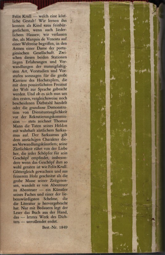 Thomas Mann ha coronato la sua vasta produzione di romanzi con il racconto del truffatore Felix Krull. L’eleganza linguistica di questa autobiografia romanzata, la sua ironica ambiguità e le azioni di Krull dimostrano che egli è “il dio dei ladri”: un tuttofare, abile nel gestire qualsiasi situazione nuova e inaspettata.