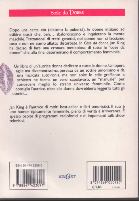 Dopo una certa età (diciamo la pubertà), le donne iniziano ad esibire tratti che sbalordiscono e inquietano la mente maschile. Trattandosi di tratti genetici, noi donne non ci facciamo caso e non ne siamo affatto disturbate. In “Cose da donne”, Jan King ha deciso di fare una cronaca meticolosa di tutte le “Cose da donne” che, alla fine, determinano il comportamento femminile. Un libro di un’autrice donna dedicato a tutte le donne. Un’opera agile ma divertentissima, pervasa da una marcata autoironia, ma non solo: lo stile graffiante e schietto ne forma un “manuale” per conoscere meglio lo strano universo femminile.