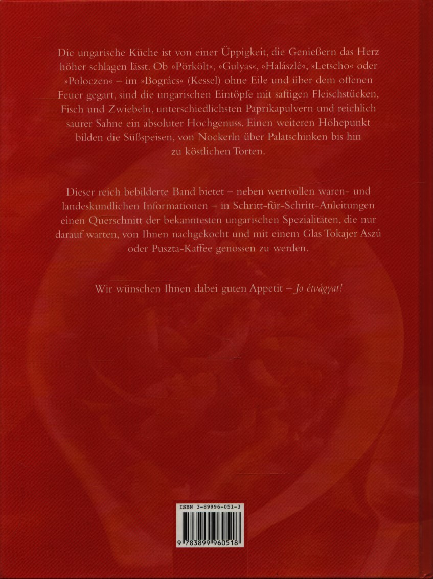 Questo volume riccamente illustrato offre, oltre a preziose informazioni sul Paese, una panoramica delle specialità ungheresi più famose, con istruzioni passo passo, che aspettano solo di essere cucinate da voi e gustate con un bicchiere di Tokaj Aszu o di caffè Puszta.