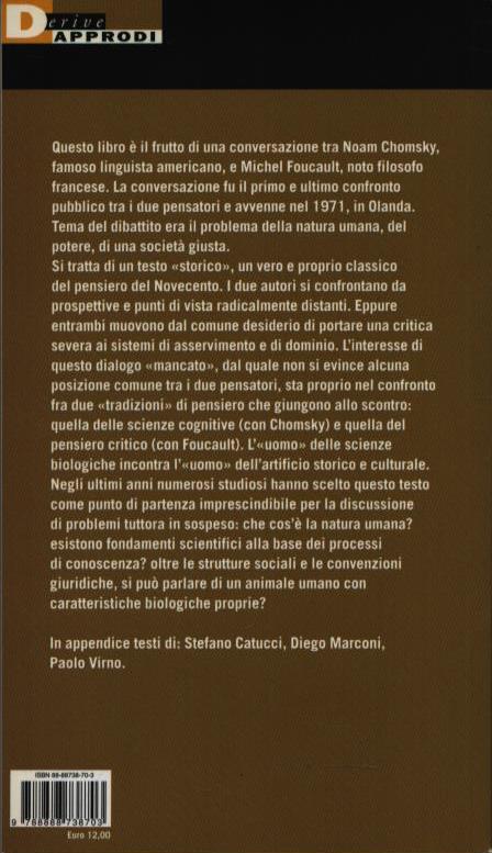 Questo libro è il frutto di una conversazione tra Noam Chomsky, famoso linguista e politologo americano, e Michel Foucault, noto filosofo e storico francese. Questa conversazione fu il primo e ultimo confronto pubblico tra i due pensatori e avvenne nel 1971, in Olanda. Tema del dibattito era il problema del potere, della giustizia e della natura umana. I due autori si confrontano da due prospettive e due punti di vista radicalmente distanti. Eppure entrambi muovono dal comune desiderio di portare una critica severa ai sistemi di asservimento e di dominio.