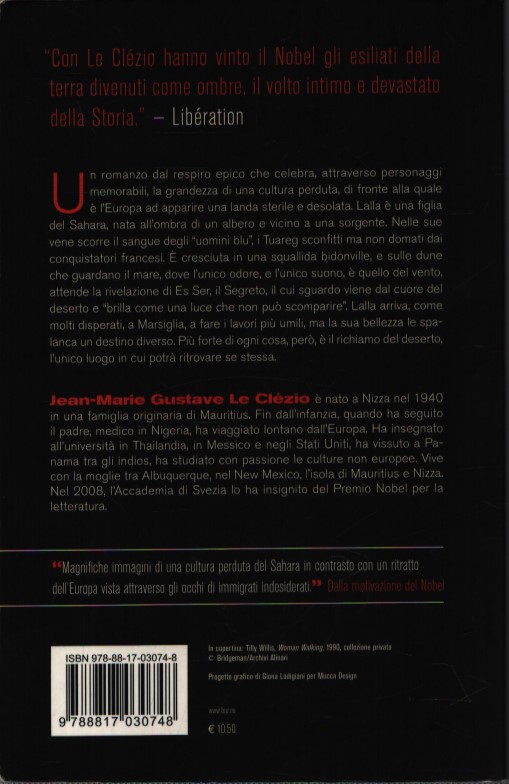 Un romanzo dal respiro epico che celebra, attraverso personaggi memorabili, la grandezza di una cultura perduta, di fronte alla quale è l’Europa ad apparire una landa sterile e desolata. Lalla è una figlia del Sahara, nata all’ombra di un albero e vicino a una sorgente. Nelle sue vene scorre il sangue degli “uomini blu”, i Tuareg sconfitti ma non domati dai conquistatori francesi. È cresciuta in una squallida bidonville, e sulle dune che guardano il mare – dove l’unico odore, e l’unico suono, è quello del vento – attende la rivelazione di Es Ser, il Segreto, il cui sguardo viene dal cuore del deserto e “brilla come una luce che non può scomparire”. Lalla arriva, come molti disperati, a Marsiglia, a fare i lavori più umili, ma la sua bellezza le spalanca un destino diverso. Più forte di ogni cosa, però, è il richiamo del deserto, l’unico luogo in cui potrà ritrovare se stessa.