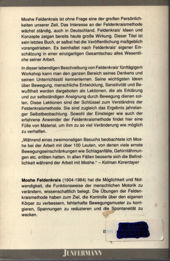 Moshe Feldenkrais è senza dubbio una delle grandi figure del nostro tempo. L’interesse per il Metodo Feldenkrais è in costante crescita, anche in Germania. Le idee e i concetti di Feldenkrais stanno già avendo un impatto significativo. Questo libro è il suo ultimo, e lui stesso ha avuto un ruolo chiave nella sua pubblicazione. Secondo Feldenkrais, offre una panoramica unica di tutti gli elementi essenziali del suo lavoro. Questa vivida descrizione del workshop di cinque giorni di Feldenkrais permette ai lettori di esplorare l’intera portata del suo pensiero e del suo stile di insegnamento. Le sue idee più importanti su movimento, sviluppo umano, sensibilità e consapevolezza sono presentate come lezioni pensate per servire da spiegazione e per l’apprendimento autonomo attraverso il movimento. Queste lezioni sono la chiave per comprendere il Metodo Feldenkrais. Sono anche il risultato di anni di auto-osservazione. Sia i principianti che i praticanti esperti del Metodo Feldenkrais troveranno qui una vasta gamma di materiale per aiutarli a ottenere il maggior cambiamento possibile.
