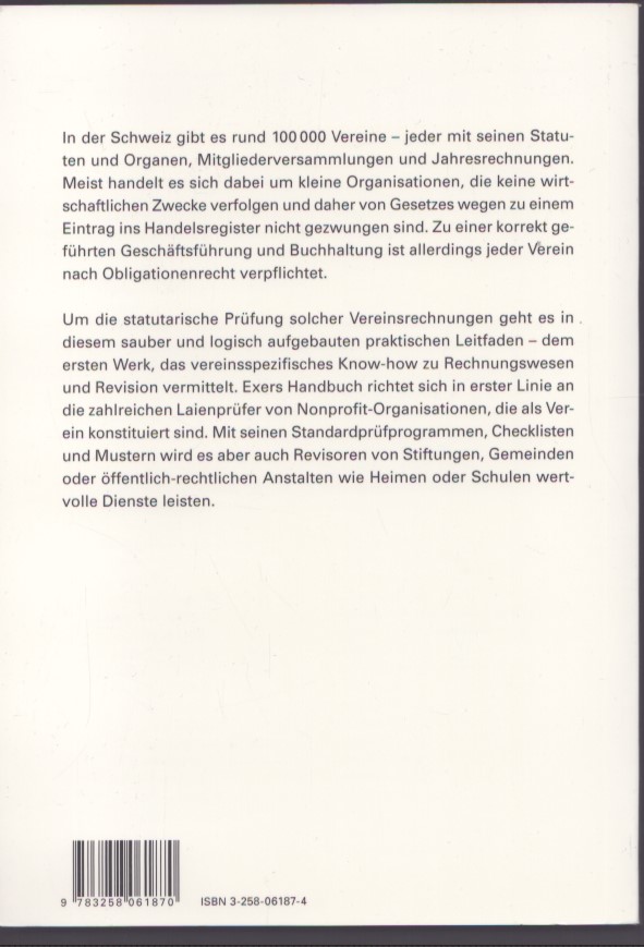 In Svizzera esistono circa 100.000 associazioni, ciascuna con propri statuti e organi direttivi, assemblee generali e conti annuali. Si tratta per lo più di piccole organizzazioni che non perseguono obiettivi economici e pertanto non sono tenute per legge a iscriversi nel registro di commercio. Tuttavia, il Codice delle obbligazioni svizzero prevede che ogni associazione tenga una corretta gestione aziendale e una contabilità regolare. Questa guida pratica, chiara e strutturata in modo logico, si concentra sulla revisione legale dei conti di tali associazioni: la prima opera a trasmettere competenze specifiche per le associazioni in materia di contabilità e revisione contabile. Il manuale di Exer si rivolge principalmente ai numerosi revisori laici di organizzazioni senza scopo di lucro costituite in associazioni. Con i suoi programmi di revisione standard, le checklist e i modelli, sarà di prezioso aiuto anche ai revisori di fondazioni, comuni o enti pubblici come case di cura o scuole.
