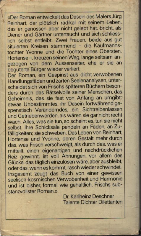 Uno dei primi romanzi di Max Frisch, non disponibile per la pubblicazione individuale da molti anni. Yvonne, figlia di una famiglia benestante, sposa l’archeologo Hinkelmann. Quando rimane incinta e lui reagisce con impotenza, lo lascia bruscamente. Yvonne vorrebbe vivere da sola a Zurigo, in Svizzera, ma si ritrova invischiata in una complicata storia d’amore con il giovane artista Jürg Reinhart. Il romanzo, “una rete di fili intrecciati e delicate analisi psicologiche, si differenzia dai libri successivi di Frisch soprattutto per la natura enigmatica dei suoi personaggi, il mistero che li circonda” (Karlheinz Deschner).