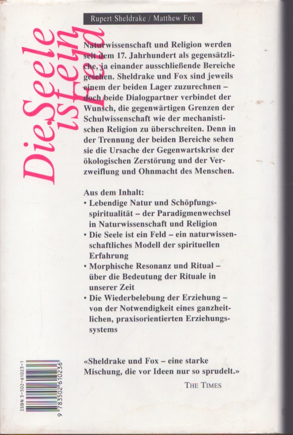 Fin dal XVII secolo, scienza e religione sono state considerate ambiti opposti, persino reciprocamente esclusivi. Sheldrake e Fox appartengono ciascuno a uno di questi due campi, eppure entrambi gli interlocutori condividono il desiderio di trascendere gli attuali confini tra scienza accademica e religione istituzionale. Vedono la separazione di queste due sfere come la causa principale dell’attuale crisi di distruzione ecologica e della disperazione e dell’impotenza dell’umanità. L’anima è un campo, un modello scientifico di esperienza spirituale.