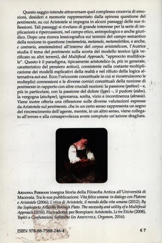 Questo saggio intende attraversare quel complesso crocevia di emozioni, desideri e memorie rappresentato dalla spinosa questione del pentimento, su cui Aristotele si impegna in alcuni passaggi delle sue riflessioni. Tali passaggi si rivelano di grande interesse per la serie di implicazioni e ripercussioni, nel campo etico, antropologico e anche giuridico. Dopo una ricerca lessicografica sulla nozione in questione all’interno del corpus aristotelicum, l’autrice studia il tema del pentimento sulla scorta del modello teorico (già verificato su altri terreni), del multifocal approach. Questo è il paradigma, tipicamente aristotelico (e, più in generale, caratteristico del pensiero antico), consistente nella costante moltiplicazione dei modelli esplicativi della realtà e nel rifiuto della logica alternativa aut-aut.