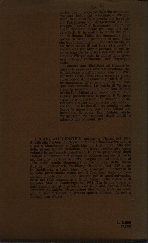 Dopo la sua prigionia a Cassino, Wittgenstein prese il diploma di maestro e dal 1920 al 1926 insegnò nelle scuole elementari di tre sperduti villaggi della Bassa Austria. Questo libro è stato scritto dal filosofo austriaco per dare ai suoi ragazzi uno strumento per impadronirsi della corretta grafia del tedesco. Quello che fece fu straordinario: allargò il loro spettro linguistico. Più ampio, infatti, è il linguaggio che si domina più estesa è la realtà che si comprende. Nel dizionario ci sono termini di uso prevalentemente austro-bavarese, termini di uso familiare, parole tipicamente austriache. Anche termini dialettali.