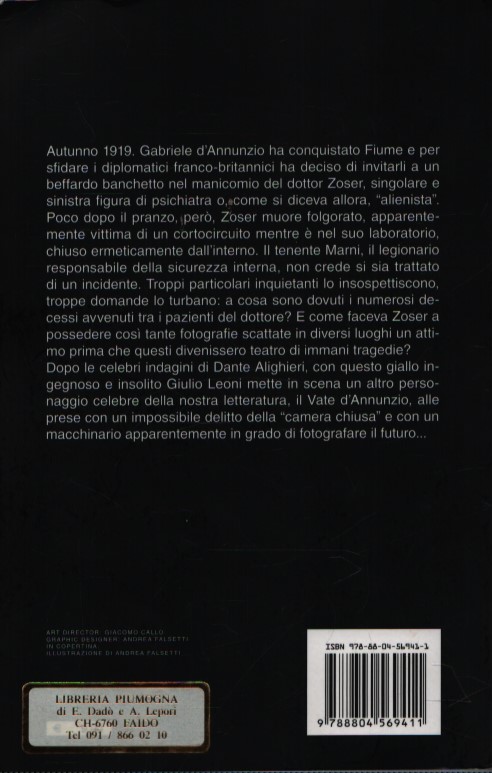 Autunno 1919. Gabriele d’Annunzio ha conquistato Fiume e per sfidare i diplomatici franco-britannici ha deciso di invitarli a un beffardo banchetto nel manicomio del dottor Zoser, singolare e sinistra figura di psichiatra o, come si diceva allora, “alienista”. Poco dopo il pranzo, però, Zoser muore folgorato, apparentemente vittima di un cortocircuito mentre è nel suo laboratorio, chiuso ermeticamente dall’interno. Il tenente Marni, il legionario responsabile della sicurezza interna, non crede si sia trattato di un incidente. Troppi particolari inquietanti lo insospettiscono, troppe domande lo turbano: a cosa sono dovuti i numerosi decessi avvenuti tra i pazienti del dottore? E come faceva Zoser a possedere così tante fotografie.