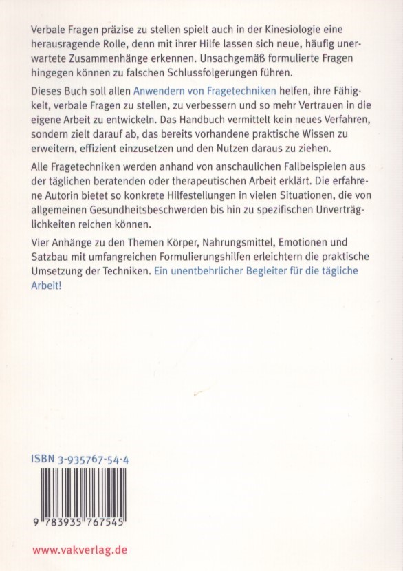 Porre domande verbali precise gioca un ruolo particolarmente importante in kinesiologia, poiché domande formulate in modo improprio possono portare a conclusioni errate. Questo libro si propone di aiutare chi pratica tecniche di interrogazione a migliorare la propria capacità di porre domande verbali e quindi ad acquisire maggiore sicurezza nel proprio lavoro. Non introduce un nuovo metodo, ma mira piuttosto ad ampliare e applicare in modo efficiente le conoscenze pratiche esistenti. Sono forniti ampi esempi di frasi per facilitarne l’implementazione pratica.