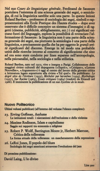 Elementi di semiologia di Roland Barthes è ormai un classico: per la semiotica, che lo annovera tra i suoi testi fondativi; per la filosofia strutturale, che vi ritrova un manifesto teorico di primo piano; per le scienze umane e sociali, verso le quali si propone come l’ultimo, utopico tentativo di unificazione metodologica; per il pensiero militante, che lo considera un modello di teoria critica della cultura e della società. Scritto nel 1964 e pubblicato per la prima volta in Italia nel 1966, concepito inizialmente come una serie di appunti per studenti, il saggio costituisce un’agile sintesi delle categorie d’analisi e dei problemi teorici della nascente semiologia e, oltre a riassumere i principi della linguistica strutturale, applica ad altri sistemi di comunicazione (il vestiario, l’arredamento, il cibo…) gli schemi usati per l’«idioma» della scuola strutturalista.
