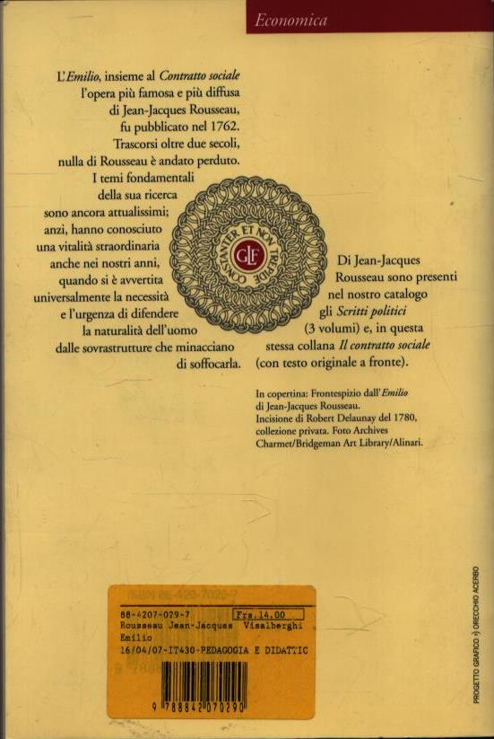 Emilio è il romanzo pedagogico per eccellenza, nonché l’opera più famosa di Rousseau insieme a Il contratto sociale. Pubblicato nel 1762, riassume tutte le conoscenze antropologiche del filosofo e ci descrive “l’uomo naturale”, un essere civile spogliato di tutto ciò che di particolare gli hanno conferito la razza, il luogo e l’epoca di nascita: ci mostra l’uomo universale nei suoi tratti più veri, generali e durevoli. È la storia dell’educazione morale e intellettuale di un individuo destinato a vivere all’interno di una società ma in grado di resistere alla corruzione che la pervade. Temi fondamentali di questa incredibile ricerca sono il rispetto della personalità e della libertà del fanciullo e il bisogno di difendere la naturalità dell’essere umano dalle sovrastrutture di una civiltà che, sempre di più, rischia di soffocarla.