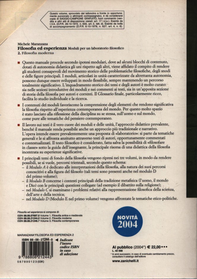 FILOSOFIA ED ESPERIENZA . MODULI PER UN LABORATORIO FILOSOFICO . FILOSOFIA MODERNA . VOLUME SECONDO