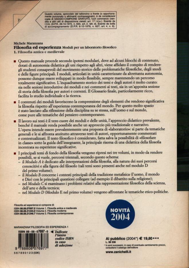 FILOSOFIA ED ESPERIENZA . MODULI PER UN LABORATORIO FILOSOFICO . FILOSOFIA ANTICA E MEDIEVALE . VOLUME PRIMO