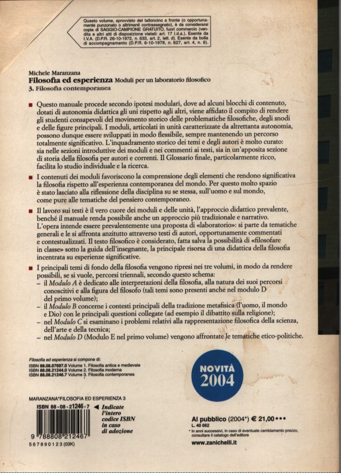 FILOSOFIA ED ESPERIENZA . MODULI PER UN LABORATORIO FILOSOFICO . FILOSOFIA CONTEMPORANEA . VOLUME TERZO