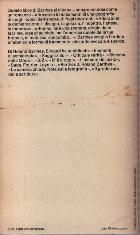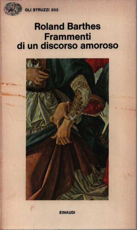 Un vocabolario che comincia con un “abbraccio” e prosegue con “cuore”, “dedica”, “incontro”, “notte”, e “piangere” in cui Barthes interviene con il suo sottile ingegno di linguista a collezionare tutti questi discorsi spuri in un unico soliloquio. Per il grande pensatore francese l’amore è un discorso sconvolgente ed egli lo ripercorre attraverso un glossario dove recupera i momenti della “sentimentalità”, opposta alla “sessualità”, traendoli dalla letteratura occidentale, da Platone a Goethe, dai mistici a Stendhal. Si realizza così un repertorio suffragato da calzanti riferimenti letterari e da obbligati riferimenti psicanalitici sul lessico in uso nell’iniziazione amorosa.