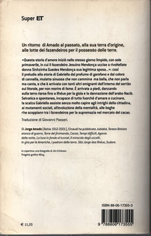 Gabriella dal profumo di garofano e dal colore di cannella, mulatta sinuosa che non cammina ma balla, che non parla ma canta, è arrivata con tanti altri emigranti dall’interno del sertão sul litorale, per non morire di fame. È arrivata a piedi, danzando sulla terra riarsa fino a Ilhéus per la gioia e la dannazione dell’arabo Nacib. Selvatica e spontanea, incapace di tutto fuorché d’amare e cucinare, la scalza Gabriella assiste senza molto capire agli intrighi della cittadina, ai mutamenti sociali, all’evoluzione della mentalità, alle beghe che scoppiano tra i fazendeiros per la supremazia nel mercato del cacao.