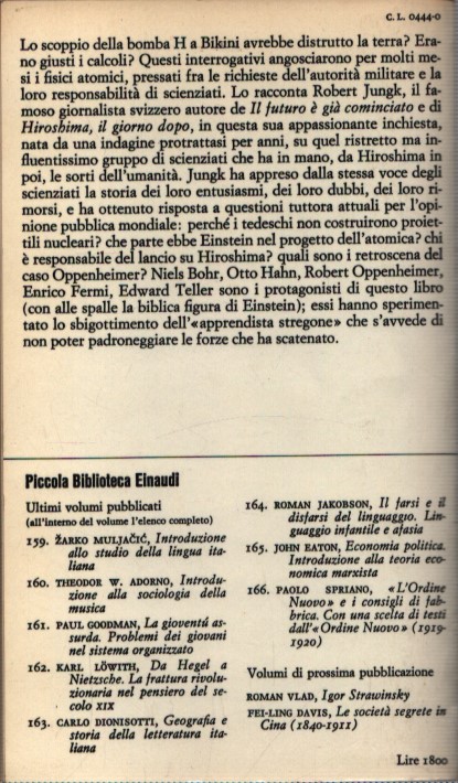 Lo scoppio della bomba H a Bikini avrebbe distrutto la Terra? Erano giusti i calcoli? Questi interrogativi angosciarono per molti mesi i fisici atomici, pressati tra le richieste dell’autorità militare e le loro responsabilità di scienziati. Lo racconta Robert Jungk, il famoso giornalista svizzero autore de “Il futuro è già cominciato” e di “Hiroshima, il giorno dopo” in questa sua appassionante inchiesta, nata da una indagine protrattasi per anni, su quel ristretto ma influentissimo gruppo di scienziati che ha in mano, da Hiroshima in poi, le sorti dell’umanità.