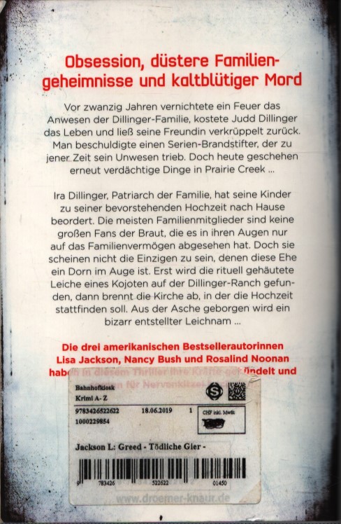Le tre autrici americane di bestseller Lisa Jackson, Nancy Bush e Rosalind Noonan uniscono le forze in “Greed”, un avvincente thriller in cui un killer psicopatico dà la caccia a un’intera famiglia. Prairie Creek, Wyoming, USA: vent’anni fa, un incendio distrusse la casa della famiglia Dillinger, costando la vita a Judd Dillinger e lasciando la sua ragazza permanentemente invalida. All’epoca, la colpa fu attribuita a un piromane seriale, che faceva parte di quell’incendio.…