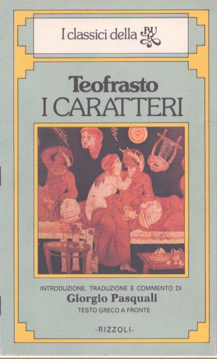 L’avaro, che quando le figlie degli amici si sposano pianifica viaggi per non dover mandare il regalo di nozze; il chiacchierone, che infligge a chiunque l’elenco di ciò che ha mangiato a pranzo o il racconto dettagliato del suo ultimo sogno; il maldicente, pronto a dire peste e corna del primo amico che lascia il banchetto. Sono solo alcuni dei trenta tipi morali presentati nei Caratteri: Teofrasto riprende un’idea del maestro Aristotele, che talvolta tratteggiava in due parole individui posseduti da un qualche vizio, e si chiede cosa tali personaggi direbbero o farebbero se posti in una certa situazione.