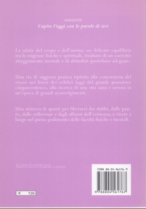 La salute del corpo e dell’anima: un delicato equilibrio tra le esigenze fisiche e spirituali, risultato di un corretto atteggiamento mentale e di abitudini quotidiane adeguate. Una via di saggezza pratica ispirata alla concretezza del vivere nei brani dei celebri saggi del grande pensatore cinquecentesco, alla ricerca di una vita sana e serena in un’epoca di grandi sconvolgimenti. Una miniera di spunti per liberarci dai dubbi, dalle paure, dalle sofferenze e dagli affanni dell’esistenza, e vivere a lungo nel pieno godimento delle facoltà fisiche e mentali.
