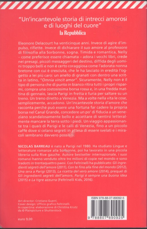 Eleonore Delacourt ha venticinque anni. Invece di agire d’impulso, riflette. Invece di dichiarare il suo amore al professore di filosofia alla Sorbonne, sogna. Timida e romantica, Nelly – come preferisce essere chiamata – adora i vecchi libri, crede nei presagi, piccoli messaggeri del destino, diffida degli uomini troppo belli e non è certo coraggiosa come l’adorata nonna bretone con cui è cresciuta, che le ha lasciato in eredità l’oggetto a lei più caro: un anello di granati con dentro una scritta in latino, “Omnia vincit amor”. Sicuramente, Nelly non è il tipo di persona che di punto in bianco ritira tutti i propri risparmi, compra una costosissima borsa rossa e, in una fredda mattina di gennaio, lascia Parigi in fretta e furia per saltare su un treno. Un treno diretto a Venezia.