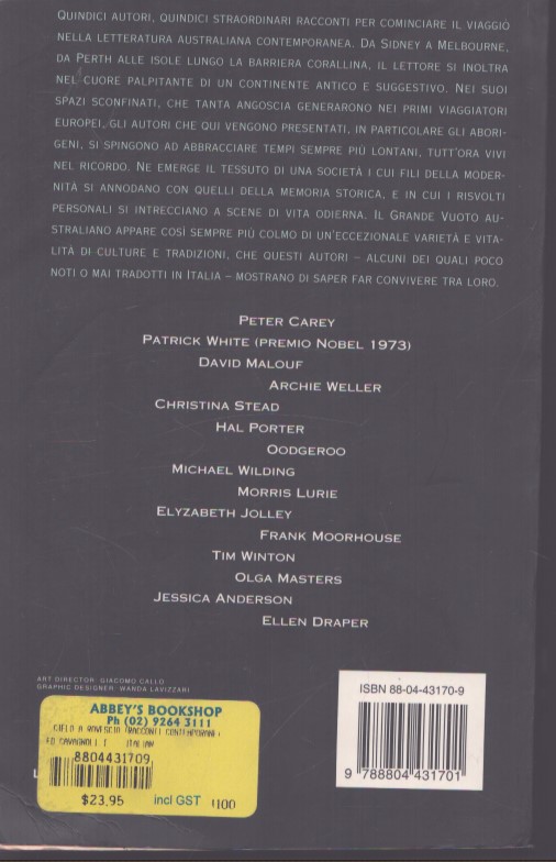 Quindici autori, quindici straordinari racconti per cominciare il viaggio nella letteratura australiana contemporanea. Da Sidney a Melbourne, da Perth alle isole lungo la barriera corallina, il lettore si inoltra nel cuore palpitante di un continente antico e suggestivo. Nei suoi spazi sconfinati, che tanta angoscia generarono nei primi viaggiatori europei, gli autori che qui vengono presentati, in particolare gli aborigeni, si spingono ad abbracciare tempi sempre più lontani, tutt’ora vivi nel ricordo. Ne emerge il tessuto di una società i cui fili della modernità si annodano con quelli della memoria storica, e in cui i risvolti personali si intrecciano a scene di vita odierna. Il Grande Vuoto australiano appare così sempre più colmo di un’eccezionale varietà e vitalità di culture e tradizioni, che questi autori – alcuni dei quali poco noti o mai tradotti in Italia – mostrano di saper convivere tra loro.