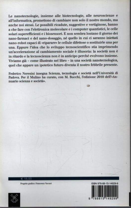 Le nanotecnologie, insieme alle biotecnologie, alle neuroscienze e all’informatica, promettono di cambiare non solo il nostro mondo, ma anche noi stessi. Le possibili ricadute, suggestive e vertiginose, hanno a che fare con l’elettronica molecolare e i computer quantistici, le celle solari superefficienti e i biosensori. E non sembra lontano il giorno dei nano-farmaci e del nano-dosaggio, né quello in cui ci saranno iniettati nano-robot capaci di “riparare” le cellule difettose o sostituirle una per una. Eppure l’idea che lo sviluppo tecnoscientifico stia imprimendo un’accelerazione al cambiamento sociale è illusoria: la società non è in ritardo e la tecnoscienza non è in anticipo perché evolvono insieme. Viviamo già – come illustrato nel libro – in una società nanotecnologica, quel che appare un ipotetico futuro diventa il nostro febbrile presente.