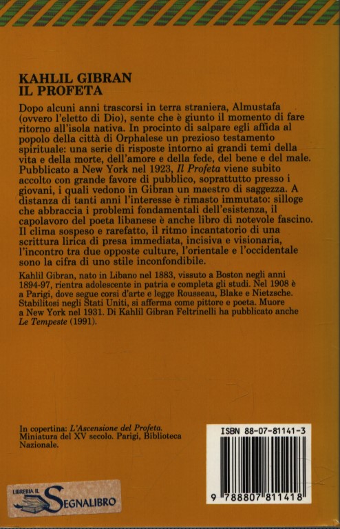 Dopo alcuni anni trascorsi in terra straniera, Almustafa (ovvero l’eletto di Dio), sente che è giunto il momento di fare ritorno all’isola nativa. In procinto di salpare egli affida al popolo della città di Orphalese un prezioso testamento spirituale: una serie di riposte intorno ai grandi temi della vita e della morte, dell’amore e della fede, del bene e del male. Pubblicato a New York nel 1923, “Il Profeta” viene subito accolto con grande favore di pubblico soprattutto presso i giovani, i quali vedono in Gibran un maestro di saggezza.