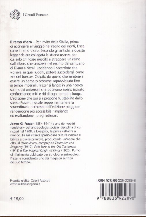 Il ramo d’oro – Per invito della Sibilla, prima di accingersi al viaggio nel regno dei morti, Enea colse il ramo d’oro. Secondo gli antichi, a questa leggenda era collegata la strana usanza per cui solo chi fosse riuscito a strappare un ramo dall’albero che cresceva nel recinto del santuario di Diana a Nemi, uccidendo il sacerdote che vigilava su quei luoghi, poteva succedergli come “re del bosco”. Colpito da quello che sembrava essere un barbaro costume sopravvissuto fino ai tempi imperiali, Frazer si lanciò in una ricerca sui motivi universali che potevano averlo ispirato, confrontando miti e riti di ogni tempo e luogo.