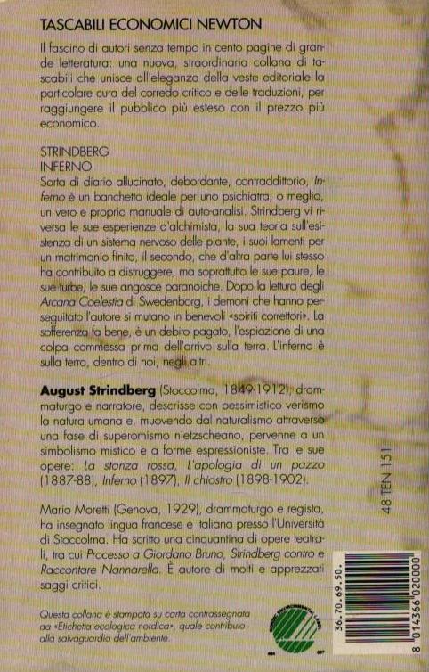 Composto di getto in meno di due mesi, tra il maggio e il giugno 1897, “Inferno” costituisce insieme il testo più misterioso, più mitico e più ironico di Strindberg. Scritto con l’abituale furia che giunge ad assumere i tratti sperimentali di una scrittura automatica, questo romanzo riflette la situazione di profonda crisi storica che ha segnato la fine dell’Ottocento e soprattutto i drammatici eventi personali dell’autore, il quale, reduce dal fallimento del suo secondo e tempestoso matrimonio, giunse a mettere in crisi tutte le proprie facoltà intellettuali e psichiche, approdando a una condizione di lucida follia: un precipitare in visionarie ossessioni che lo portarono a occuparsi, tra l’altro, di magia e di occultismo.