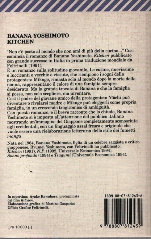 “Non c’è posto al mondo che io ami più della cucina…”. Così comincia il romanzo di Banana Yoshimoto, “Kitchen”. Le cucine, nuovissime e luccicanti o vecchie e vissute, riempiono i sogni della protagonista Mikage, rimasta sola al mondo dopo la morte della nonna, e rappresentano il calore di una famiglia sempre desiderata. Ma la famiglia si può non solo scegliere, ma anche inventare. Così il padre del giovane amico Yuichi può diventare o rivelarsi madre e Mikage può eleggerli come propria famiglia, in un crescendo tragicomico di ambiguità. Con questo romanzo, e il breve racconto che lo chiude, Banana Yoshimoto si è imposta all’attenzione del pubblico italiano mostrando un’immagine insolita del Giappone , con un linguaggio fresco e originale, quasi una rielaborazione letteraria dello stile dei fumetti manga.