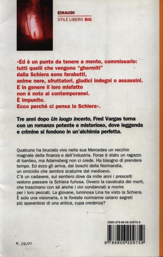 Qualcuno ha bruciato vivo nella sua Mercedes un vecchio magnate della finanza e dell’industria. Forse è stato un ragazzo di banlieu, ma Adamsberg non ci crede. Ha bisogno di prendere tempo. Ed ecco gli arriva, dai boschi della Normandia, un omicidio che sembra scaturire dal medioevo. C’è un cadavere, sul sentiero dove da mille anni i prescelti vedono passare la Schiera furiosa. Ovvero la cavalcata dei morti, che trascinano con sé anche i vivi condannati a morire per i loro peccati. La giovane, luminosa Lina ha visto la Schiera. È solo una visionaria, o le foreste normanne celano segreti più spaventosi di una antica, cupa credenza?