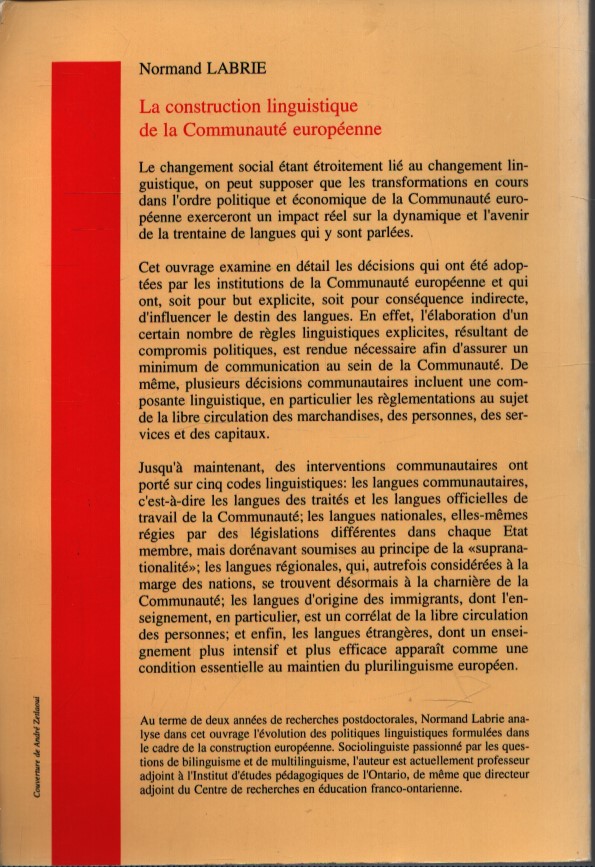 Il nuovo ordine politico ed economico della Comunità influenzerà probabilmente le dinamiche e il destino delle circa trenta lingue che vi si parlano. Questo libro esamina in dettaglio le decisioni adottate dalle istituzioni comunitarie che potrebbero contribuire a tale fenomeno di cambiamento linguistico. Infatti, lo sviluppo di una serie di regole linguistiche esplicite, frutto di compromessi politici, è necessario per garantire un livello minimo di comunicazione all’interno della Comunità. Analogamente, diverse decisioni comunitarie includono una componente linguistica, in particolare le normative volte a garantire la libera circolazione di merci, persone, servizi e capitali.