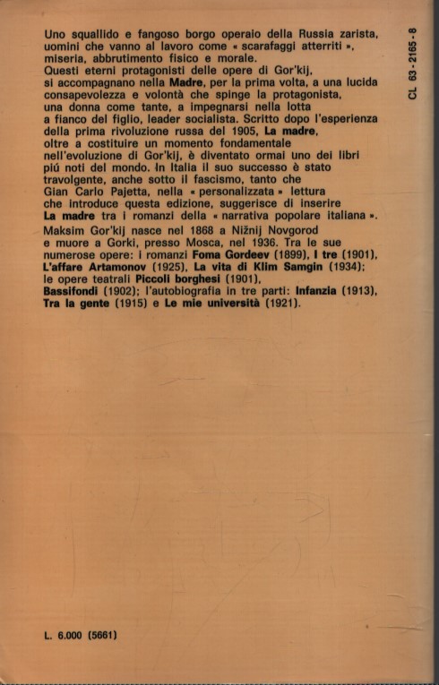 L’evoluzione della protagonista, da donna succube delle violenze di un marito ubriacone a donna emancipata, fiera del figlio, combattente di primo piano per la difesa dei diritti degli sfruttati, emerge con un crescendo lungo le pagine del romanzo. Così come emerge l’interessante intreccio con la figura di Cristo, non considerato come Dio, ma come predicatore della giustizia e dell’amore per il prossimo. “Ama lituo prossimo come te stesso”. “Verranno i giorni felici” – dice la madre diventata una attivista clandestina dei lavoratori in lotta contro le prepotenze dei padroni e dello Stato che li difende – “ci sono nemici cattivi, avidi, falsi che ci tengono prigionieri, ci legano, ci schiacciano. Contro tutto questo combattono l nostri figli, per amore di tutti, per amore della verità di Cristo.