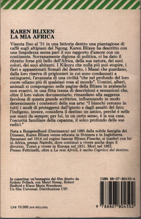 Vissuta fino al 1931 in una fattoria dentro una piantagione di caffè sugli altipiani del Ngong, Karen Blixen ha descritto con una limpidezza senza pari il suo rapporto d’amore con l’Africa. Sovranamente digiuna di politica, ci ha dato il ritratto forse più bello del continente nero, della sua natura, dei suoi colori, dei suoi abitanti. I Kikuyu che nulla più può stupire, i fieri e appassionati Somali del deserto, i Masai che guardano, dalla loro riserva di prigionieri in cui sono condannati a estinguersi, l’avanzata di una civiltà “che nel profondo del loro cuore odiano più di qualsiasi cosa al mondo”. Uomini, alberi, animali si compongono nelle pagine della Blixen in arabeschi non evasivi, in una fitta trama di descrizioni e sensazioni che, oltre il loro valore documentario, rimandano alla saggezza favolosa di questa grande scrittrice..