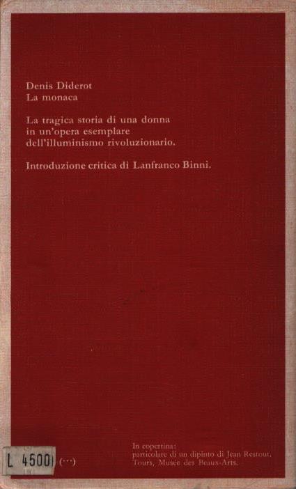 Figlia adulterina d’una famiglia aristocratica, Suzanne è costretta a farsi monaca. La sua incrollabile volontà di ribellione e infine la fuga non sortiscono però liberazione: la sventurata è perseguitata e torturata dalla riprovazione della società: la società delle famiglie fondate sul patrimonio, dei conventi fondati sulla violenta complicità tra guardiane e recluse, della religione a garanzia della frustrazione dei bisogni vitali. Sostenuto da un’analisi psicologica audace e penetrante, è considerato uno dei migliori racconti di Diderot, focoso, misurato e ravvivato da una profonda umanità.