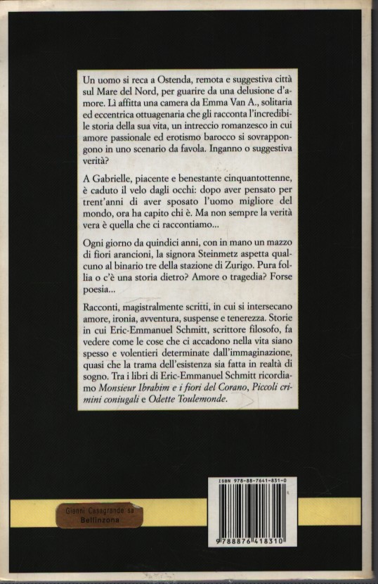 Un uomo si reca a Ostenda, remota e suggestiva città sul Mare del Nord, per guarire da una delusione d’amore. Lì affitta una camera da Emma Van A., solitaria ed eccentrica ottuagenaria che gli racconta l’incredibile storia della sua vita, un intreccio romanzesco in cui amore passionale ed erotismo barocco si sovrappongono in uno scenario da favola. Inganno o suggestiva verità? A Gabrielle, piacente e benestante cinquantottenne, è caduto il velo dagli occhi: dopo aver pensato per trent’anni di aver sposato l’uomo migliore del mondo, ora ha capito chi è. Ma non sempre la verità vera è quella che ci raccontiamo. Ogni giorno da quindici anni, con in mano un mazzo di fiori arancioni, la signora Steinmetz aspetta qualcuno ..