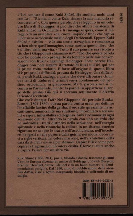 «“Lei conosce il conte Kuki Shuzo. Ha studiato molti anni con Lei”. “Rivolta al conte Kuki rimane la mia memoria riconoscente”». Con queste parole, che si leggono in un celebre libro di Heidegger, si può dire che affiori l’esistenza di Kuki Shuzo in Occidente e lì rimanga sospesa, come il miraggio di un orientale «dal cuore limpido e fine» che capiva il pensiero occidentale meglio degli Occidentali. Eppure Kuki Shuzo è esistito – e la sua storia travagliata e romanzesca va ben oltre quell’immagine, come mostra questo libro, che è il libro della sua vita. «“Tutto il suo pensare era rivolto a ciò che i Giapponesi chiamano iki”. “Ciò che questa parola dice ho potuto solo presagirlo da lontano nelle mie conversazioni con Kuki”» aggiunge Heidegger. Forse perché Heidegger non poté leggere il trattato di Kuki sull’iki, qui per la prima volta tradotto. E forse all’origine di questo libro vi è proprio la difficoltà provata da Heidegger. Una difficoltà, pensò Kuki, analoga a quella che deve affrontare chiunque tenti di tradurre il termine essere, fondamento del pensiero occidentale, in giapponese.