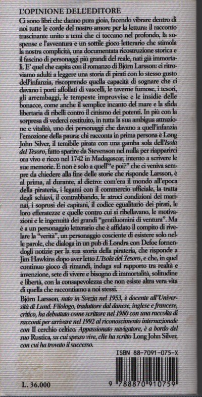 Ci sono libri che danno pura gioia. È quel che capita con il romanzo di Larsson: ci ritroviamo adulti a leggere una storia di pirati con lo stesso gusto dell’infanzia, riscoprendo quella capacità di sognare che ci davano i porti affollati di vascelli, le taverne fumose, i tesori, gli arrembaggi, le tempeste improvvise e le insidie delle bonacce. Chi racconta in prima persona è Long John Silver, il terribile pirata con una gamba sola dell'”Isola del Tesoro”, fatto sparire da Stevenson nel nulla per riapparirci ora vivo e ricco nel 1742 in Madagascar, intento a scrivere le sue memorie.