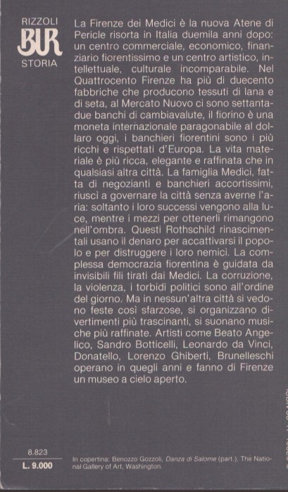 È il febbraio 1469 e uno straniero in visita a Firenze si meraviglia nell’udire il chiasso di una festa magnifica, dove compaiono schiere di paggi, giostre di stendardi e trombe, argenti, pietre preziose, persino leopardi al guinzaglio. Un’insegna, più alta di tutte, porta lo stemma dei tre gigli, e una frase ricamata in oro: Il tempo ritorna. Sono i festeggiamenti per il matrimonio di Lorenzo de’ Medici con Clarice Orsini, che dureranno per molti giorni, regalando a Firenze uno splendore unico per l’epoca. L’influenza della famiglia Medici, grazie alla lungimiranza e alla prudenza di Cosimo, e alla politica abile e illuminata di Lorenzo, crescerà fino a diventare una vera e propria egemonia, e durerà fino al 1737, trasformando le basi e la società della repubblica fiorentina. La rievocazione di Lucas-Dubreton ci permette di scendere nelle strade della città, seguire i giochi, i passatempi ma anche la vita pubblica del giovane comune in piena crescita.