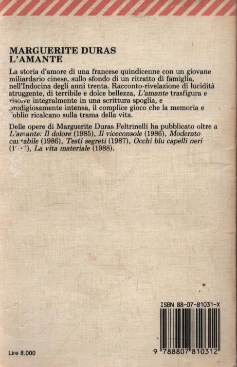 La storia d’amore di una francese quindicenne con un giovane miliardario cinese, sullo sfondo di un ritratto di famiglia, nell’Indocina degli anni trenta. Racconto di lucidità struggente, di terribile e dolce bellezza, “L’amante” trasfigura e risolve integralmente in una scrittura spoglia e intensa, il complice gioco che la memoria e l’oblio ricalcano sulla trama della vita.