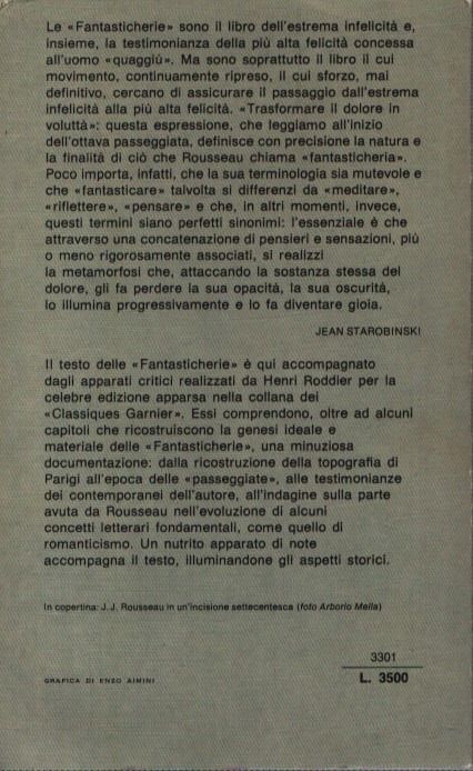 Le Fantasticherie nascono dagli appunti sparsi che Rousseau stilava nel corso di lunghe passeggiate solitarie, meditando sulla natura, sulla società, sul rapporto tra sé e gli altri. Il filosofo francese rievoca così il proprio passato, descrivendone sensazioni e sentimenti con accenti vivissimi. Il risultato di queste riflessioni sono alcune tra le più belle pagine della letteratura moderna, animate da una freschezza sempre nuova. Il testo è qui accompagnato dagli apparati critici realizzati da Henri Roddier per la celebre edizione dei Classiques Garnier. Oltre ad alcuni capitoli che ricostruiscono la genesi ideale e materiale dell’opera, il curatore offre preziosi documenti: dalla ricostruzione della topografia di Parigi all’epoca delle “passeggiate” alle testimonianze dei contemporanei dell’autore, all’indagine sulla parte avuta da Rousseau nell’evoluzione di alcuni concetti letterari fondamentali.