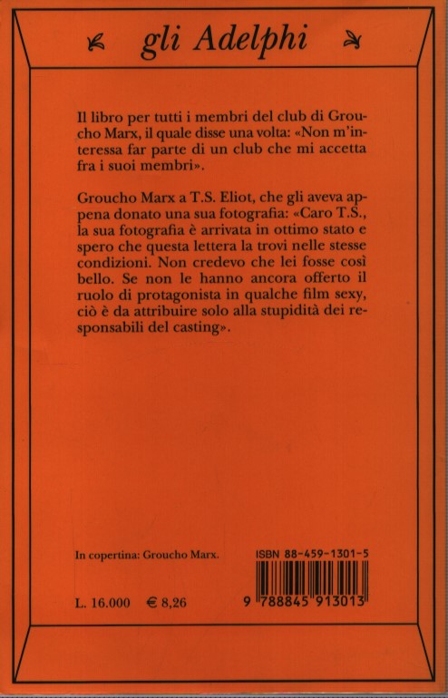 Groucho Marx a T.S. Eliot, che gli aveva appena donato una sua fotografia: “Caro T.S., la sua fotografia è arrivata in ottimo stato e spero che questa lettera la trovi nelle stesse condizioni. Non credevo che lei fosse così bello. Se non le hanno ancora offerto il ruolo di protagonista in qualche film sexy, ciò è da attribuire solo alla stupidità dei responsabili del casting.”