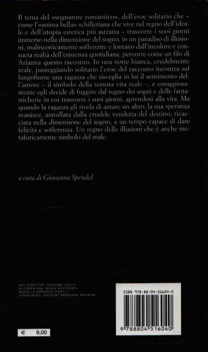 Quattro notti e un mattino per raccontare una storia che si muove al buio e nella penombra della coscienza. Un giovane sognatore, abituato a nutrirsi di sentimenti e impressioni, incontra nella notte una ragazza piangente e sola che sarà per lui l’appiglio verso il concreto mondo diurno. La città di San Pietroburgo saprà cullare nel suo bianco silenzio questa storia a due voci, fatta di confidenze notturne, attese e speranze e il mattino, al risveglio, rimarrà quello strano sapore in bocca, quella domanda di realtà inevasa: nelle notti bianche, negli improbabili intrecci e nei sussurri furtivi di due ipotetici amanti, qual è il vero confine del sogno?
