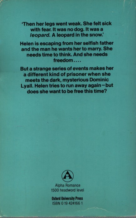 Helen non riusciva a credere ai suoi occhi quando, bloccata nella neve nelle terre selvagge del Cumberland, si ritrovò di fronte a un leopardo! Ma per fortuna era un esemplare addomesticato, e il suo proprietario, il misterioso Dominic Lyall, riuscì a offrire a Helen rifugio nella sua casa. Ben presto, tuttavia, la situazione si trasformò in un incubo quando si rese conto che lui intendeva tenerla lì, praticamente prigioniera, e nessuno aveva idea da dove cominciare a cercarla! Come poteva scappare? E, col passare del tempo,……