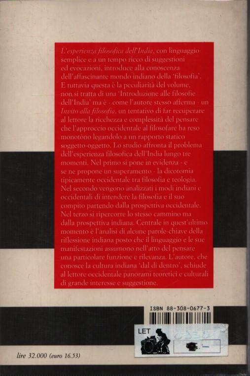 L’Autore introduce alla conoscenza dell’affascinante mondo indiano della “filosofia”, schiudendo al lettore occidentale panorami teoretici e culturali di grande interesse. La particolarità di questo volume è quella di essere un invito alla filosofia, un tentativo di far recuperare al lettore la ricchezza e la complessità del pensare che l’approccio occidentale al filosofare ha reso monotono legandolo a un rapporto statico soggetto-oggetto.