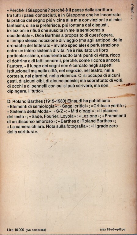 “Perché il Giappone? perché è il Paese della scrittura: fra tutti i Paesi conosciuti, è in Giappone che ho incontrato la pratica del segno più vicina alle mie convinzioni”. Dice Barthes a proposito di quest’opera, al tempo stesso notazione di viaggio (ma agli antipodi delle cronache del letterato) e perlustrazione entro un intero sistema di vita. “Il luogo dei segni non è cercato negli aspetti istituzionali ma nella città, nel negozio, nel teatro, nella cortesia, nei giardini, nella violenza. Ci si occupa di alcuni gesti ricorda ancora l’autore – di alcuni cibi, di alcune poesie; ma soprattutto di volti, di occhi e di pennelli con cui si può scrivere, ma non dipingere, il tutto”.